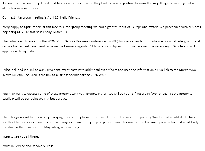 What’s New at Intergroup What’s New at Intergroup - March 2026 Contact Us Call Us: 732-637-9420 Mail Us: CJIOA, 402 Main Street, Unit 100-255, Metuchen NJ 08840 Click here to sign up for our email alerts. Click here to have your meeting changes posted to the Website.