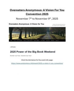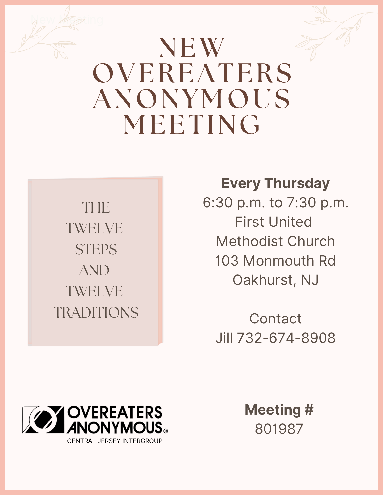 Events Here you can find flyers for in-person, virtual and hybrid events. Click here for our Meetings List. Click here to read announcements from our meetings. OA Region 7 Convention - Sat. November 1, 2025 - Virtual A Vision For You Convention - Flyer Event Info Page Link In person - Newark, NJ November 7-9, 2025 IDEA Day - Sat. November 22, 2025 - In person NEW FACE-TO-FACE MEETING! Thursdays 6:30pm Oakhurst Newcomers Welcome! Learn about OA - First Wednesday of every month (ZOOM meeting) Beginners/Newcomers Discussion - Mondays Freehold 10AM EST (in person) Thursdays 7pm EST Zoom - 12 Traditions Study Fridays 10 AM Jackson (in person) - Step Study - Join us any time!