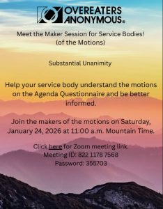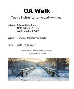 Events Here you can find flyers for in-person, virtual and hybrid events. Click here for our Meetings List. Click here to read announcements from our meetings. SJOA Virtual Event Saturday January 10th, 2026, Why People Keep Coming Back OA Walk - Allaire Park, Wall - Sunday, Jan. 18, 2026 Meet the Maker Session (for Motions on the WSBC Agenda) - Sat. January 24, 2026 (1:oo PM EST) Beginners/Newcomers Discussion - Mondays Freehold 10AM EST (in person) Newcomers Welcome! Learn about OA - First Wednesday of every month (ZOOM meeting) Fridays 10 AM Jackson (in person) - Step Study - Join us any time! NEW FACE-TO-FACE MEETING! Thursdays 6:30pm Oakhurst Thursdays 7pm EST Zoom - 12 Traditions Study (ZOOM)