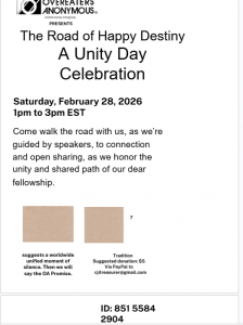 Events Here you can find flyers for in-person, virtual and hybrid events. Click here for our Meetings List. Click here to read announcements from our meetings. Central Jersey Intergroup Unity Day- Saturday February 28th, 2026- Virtual Call to Service Outreach Committee NEW FACE-TO-FACE MEETING! Thursdays 6:30pm Oakhurst Beginners/Newcomers Discussion - Mondays Freehold 10AM EST (in person) Newcomers Welcome! Learn about OA - First Wednesday of every month (ZOOM meeting) Fridays 10 AM Jackson (in person) - Step Study - Join us any time! Thursdays 7pm EST Zoom - 12 Traditions Study (ZOOM)